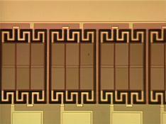 It consists of a two-layer structure. An interconnecting readout circuitry is applied to the silicon process wafer and then the microbolometer structure is built on top of the readout circuitry. First a pattern of islands _ wavelength thick are deposited on the readout circuitry. The islands are made of a material that can be selectively etched away later to form a bridge structure. Three layers -- silicon nitride, vanadium oxide, and silicon nitride -- are deposited over the sacrificial islands. The sacrificial islands are then etched away leaving the thermally isolated bridge structure of vanadium oxide. A photo of an early Honeywell microbolometer element is shown in the picture below followed by a photo of one corner of a 320 by 240 microbolometer array |