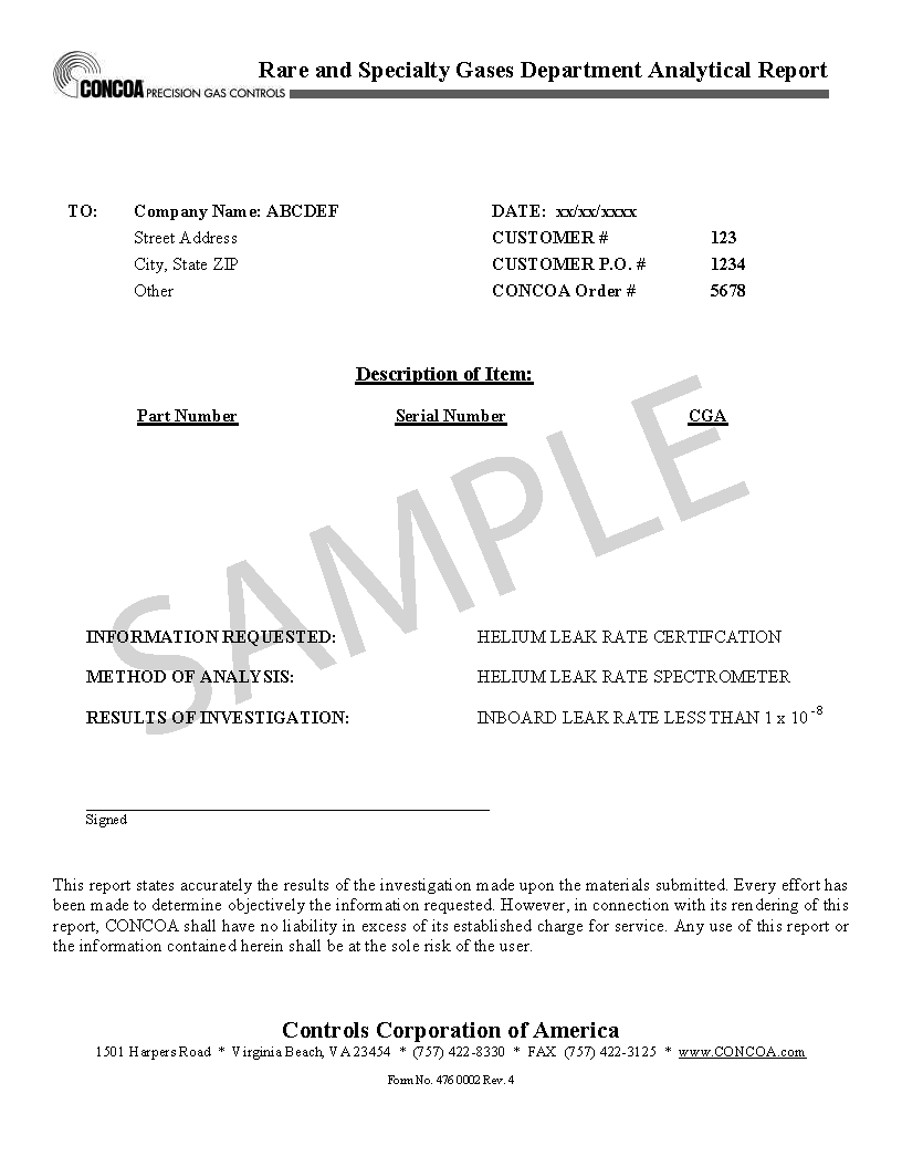 規(guī)格:美國CONCOA公司氦氣泄露證書(例子)